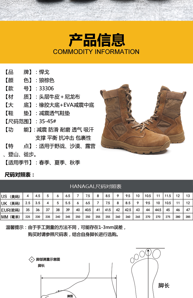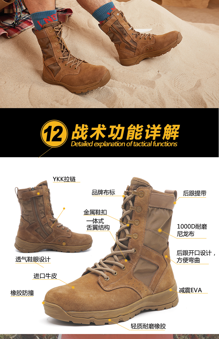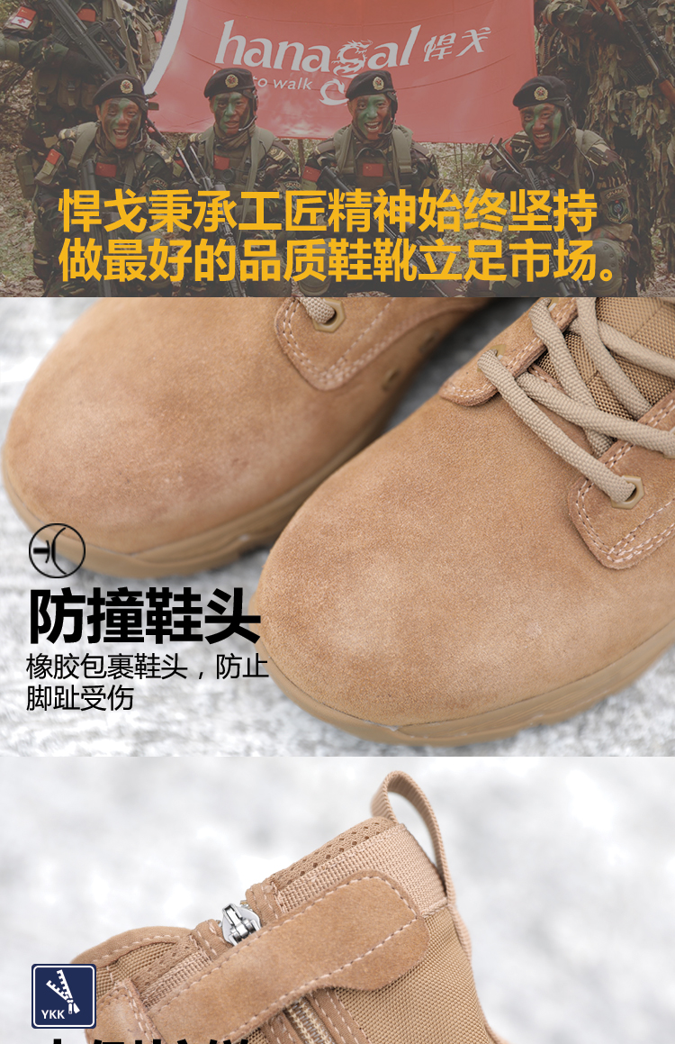 悍戈户外新款33302徒步沙漠靴真皮高帮马丁靴战术靴YKK拉链